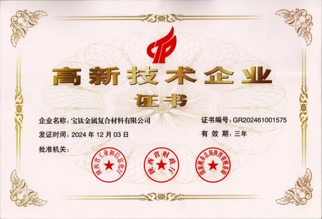 宝钛复合材公司通过“高新技术企业”认定