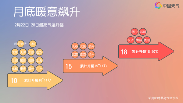 最高气温迅速回升的同时,最低气温也将逐步升高。预计28日前后最低气温0℃线退至河北北部至山西中部,南方多地最低气温将回升到10℃以上。