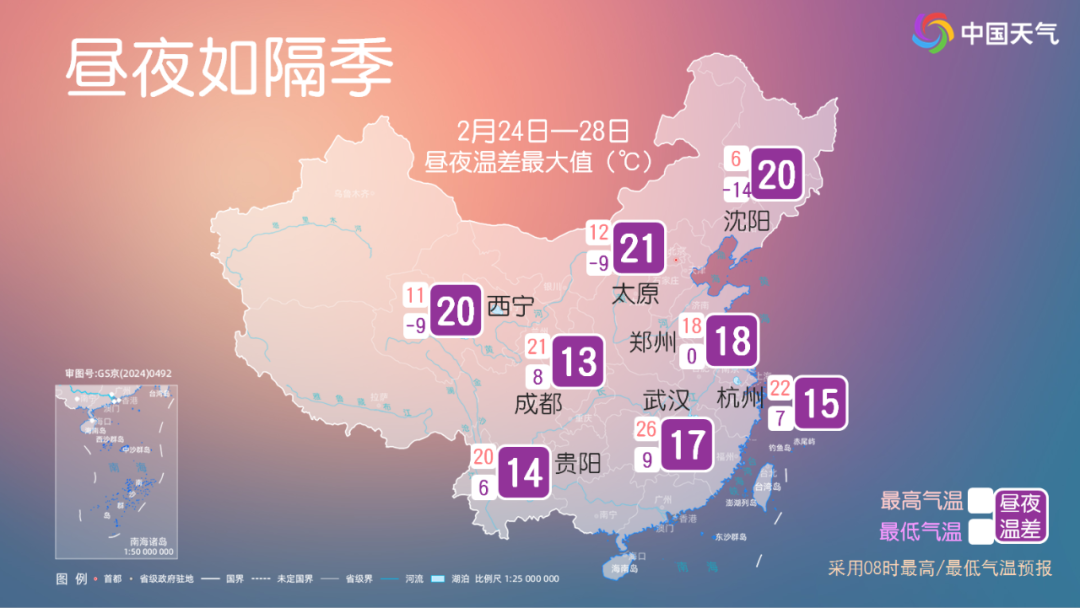 不过最低气温的升温幅度和速度都不及最高气温,下周南北方昼夜温差有所加大,北方多地昼夜温差将超过15℃,27日至28日江南等地昼夜温差也将超过10℃。