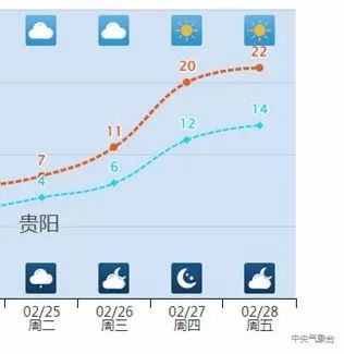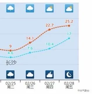 其中,一些城市的升温是“旱地拔葱”式的。长沙25日至27日最高气温分别为9℃→14℃→23℃,直接一键切换到春天模式。贵阳26日最高气温11℃,27日就升至20℃,一天升幅达9℃。