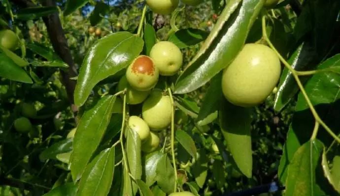 三、果核形成期(6~7月):加强对食果类盲蝽象和斑点病的防治,0.3%甲维盐加1.8%阿维菌素或9.5%螨即死乳油防治盲蝽象类、红蜘蛛等虫害类;用氟硅唑防治斑点病;对于桃小食心虫、棉铃虫,可用茚虫威等进行防治;加强对枣锈病的检测预防,可结合防治斑点病,自7月10日开始,使用氟硅唑等农药预防枣锈病,每隔7~10天用药一次,特别是雨后3天内一定要喷药保护,可有效防治枣锈病的发生。