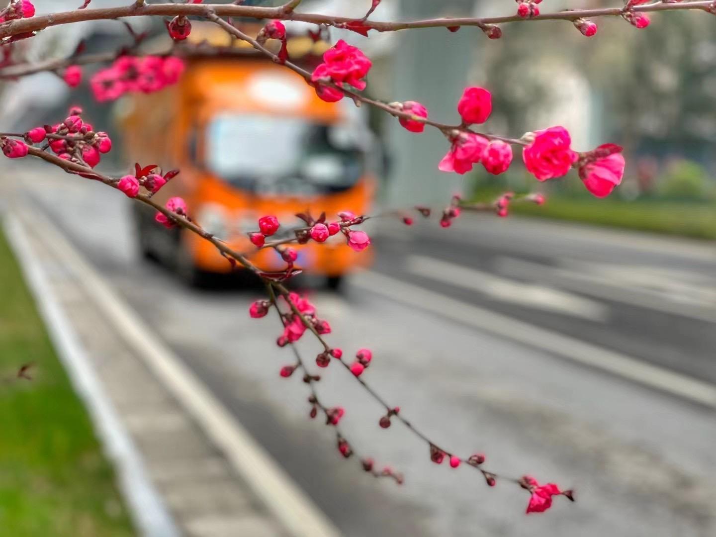 红梅报春,这两天高新路上的红梅已经层叠错落,铺展开来。一团团、一簇簇、一树树,形态各异的梅花争相绽放,婀娜多姿。