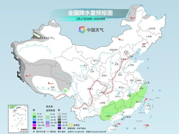 明后天,南方降雨明显减少,新疆、西藏仍有雨雪天气。