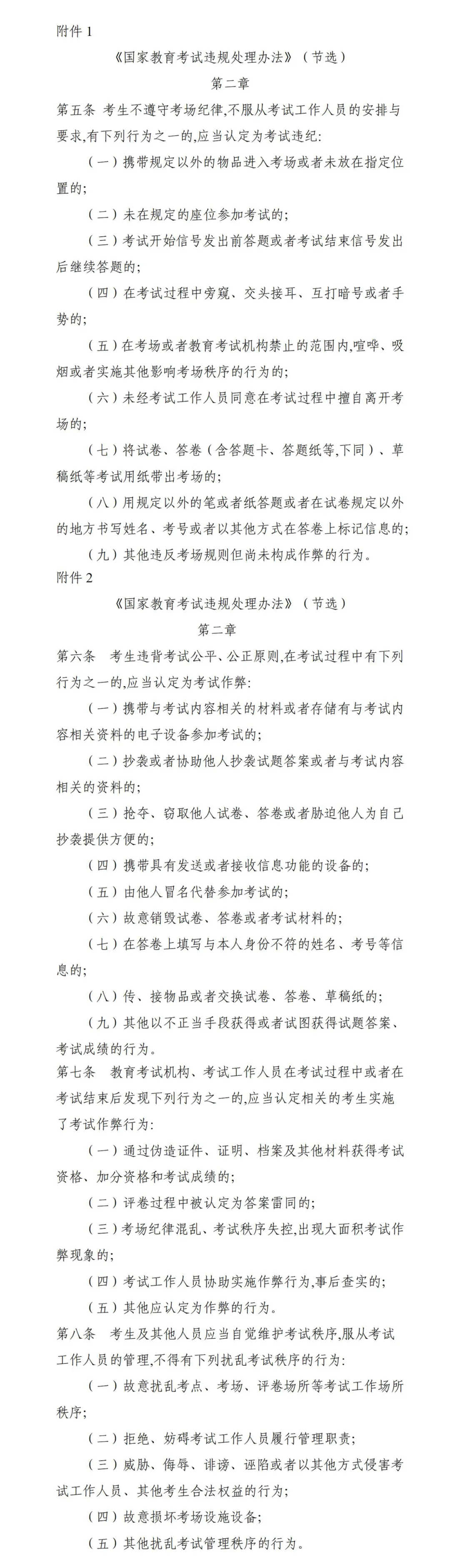 考试违纪、作弊、违法按照《国家教育考试违规处理办法》《教师资格条例》《刑法修正案(九)》等有关规定处理。其中,违反《国家教育考试违规处理办法》第五条的(见附件1),视为考试违纪,取消该科目的考试成绩;违反《国家教育考试违规处理办法》第六条、第七条、第八条的(见附件2)视为考试作弊,其本次报名参加考试的各科成绩无效,3年内不得再次参加教师资格考试;构成犯罪的,由司法机关依法追究刑事责任。