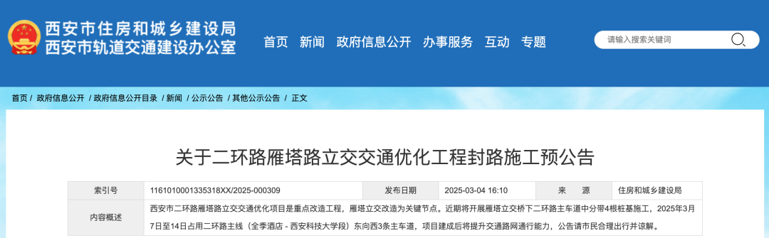 关于二环路雁塔路立交交通优化工程封路施工预公告