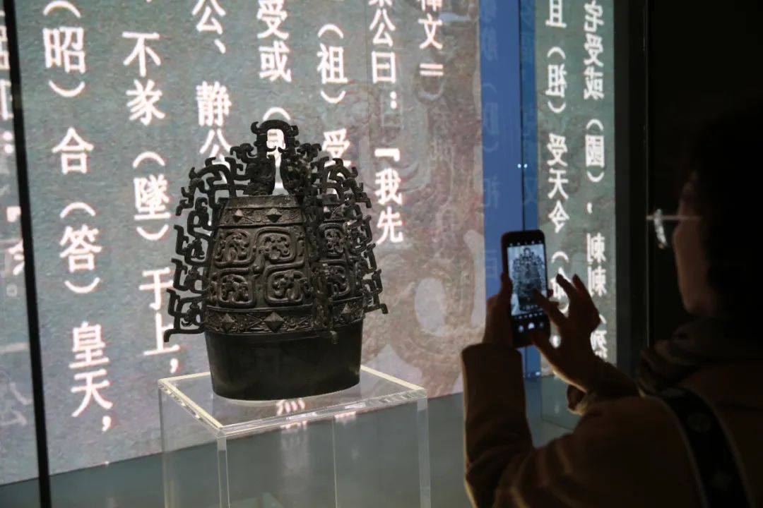 西部机场博物馆内游客正在观赏秦公镈。