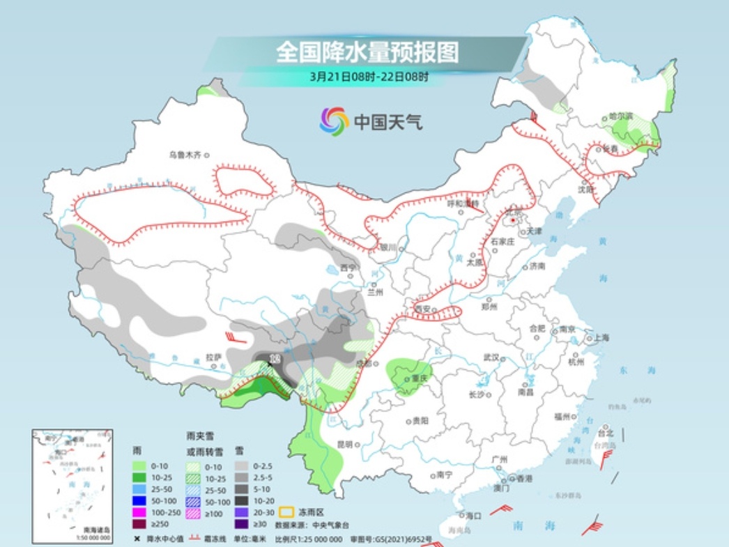 具体来看,今天,新疆南疆盆地西南部、西藏东部、青海东南部、川西高原中北部以及内蒙古东北部、黑龙江北部等地部分地区有小雪或雨夹雪,其中,西藏东部、青海东南部、川西高原北部等地部分地区有中到大雪。西藏东南部、四川盆地南部、重庆西南部、贵州西部、云南西北部和东北部、台湾岛大部等地部分地区有小雨。