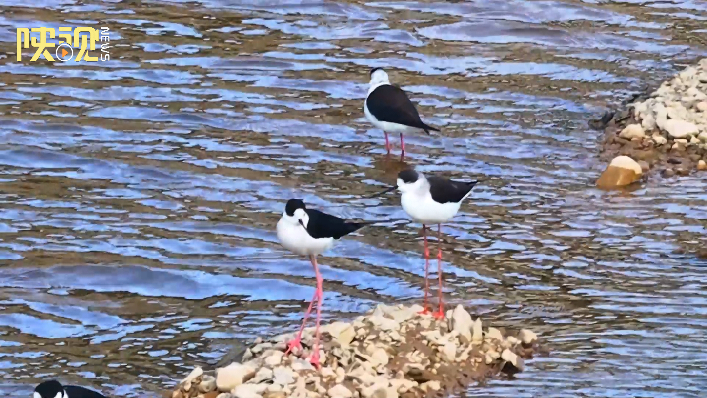 四月甘泉,候鸟北归。在延安市甘泉县道镇府村川水库湿地,30余只国家"三有"(有益、有重要经济价值、有科学研究价值)保护动物黑翅长脚鹬惊艳亮相。