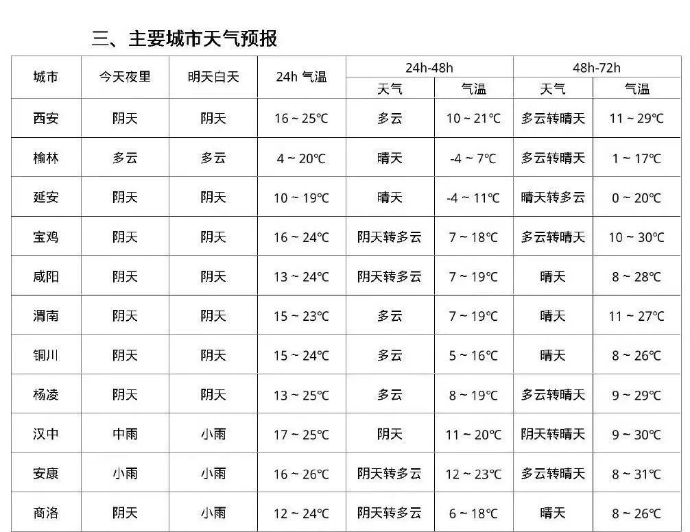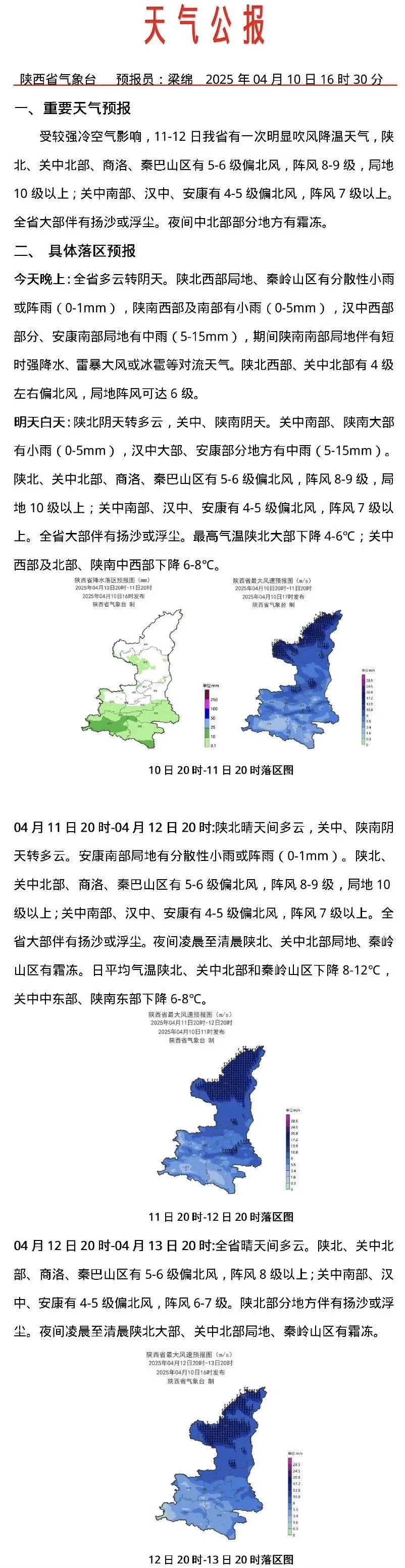 寒潮降温:受寒潮影响,预计4月10日20时至12日20时,日平均气温陕北下降12°C~14℃,局地超过14℃;关中、陕南下降8°C~10℃。预计最低气温陕北、关中、商洛、秦巴山区出现在12日清晨:陕北北部-8°C~-5°C,陕北南部-5°C~0°C;关中北部-3°C~0°C,关中南部3°C~8°C,商洛2°C~6°C,奉巴山区-5°C~0°C:汉中、安康出现在13日清晨,降至4°C~8°C。大风:11日凌晨开始至13日,陕北、关中北部、商洛、泰巴山区有5~6级偏北风,阵风8~9级,局地10级以上:关中南部、汉中、安康有4~5级偏北风,阵风7~8级。全省大部伴有沙尘天气。本次过程气温下降剧烈,感冒指数高,易引发脆弱人群心脑血管和感冒等疾病,需提前防范寒潮对生产生活、公众健康等产生的不利影响。另外,农作物低温冻害风险较高,建议提前采取措施,增强作物抗寒能力。前期降水稀少,气温高,叠加大风天气影响,森林草原火险气象等级高,需严密监视,做好防灭火工作。大风沙尘影响范围大,建议做好人体健康防护和户外设施防风加固工作。