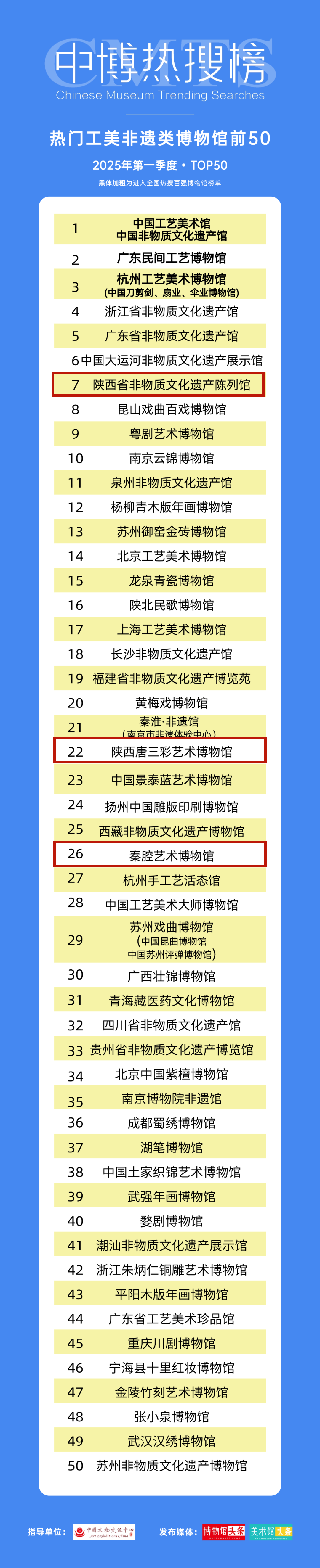 陕西省非物质文化遗产陈列馆、陕西唐三彩艺术博物馆、秦腔艺术博物馆入选2025年第一季度“热门工美非遗类博物馆前50”榜单。