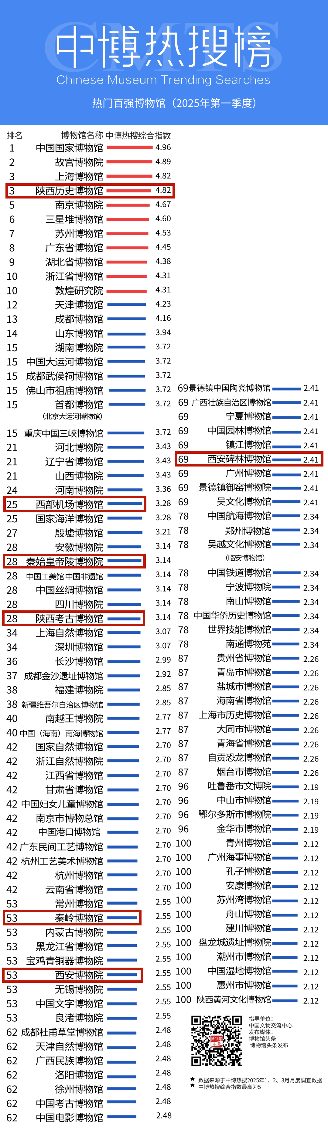 陕西历史博物馆、西部机场博物馆、秦始皇帝陵博物院、陕西考古博物馆、秦岭博物馆、西安博物院、西安碑林博物馆入选2025年第一季度“全国热门博物馆百强”榜单。