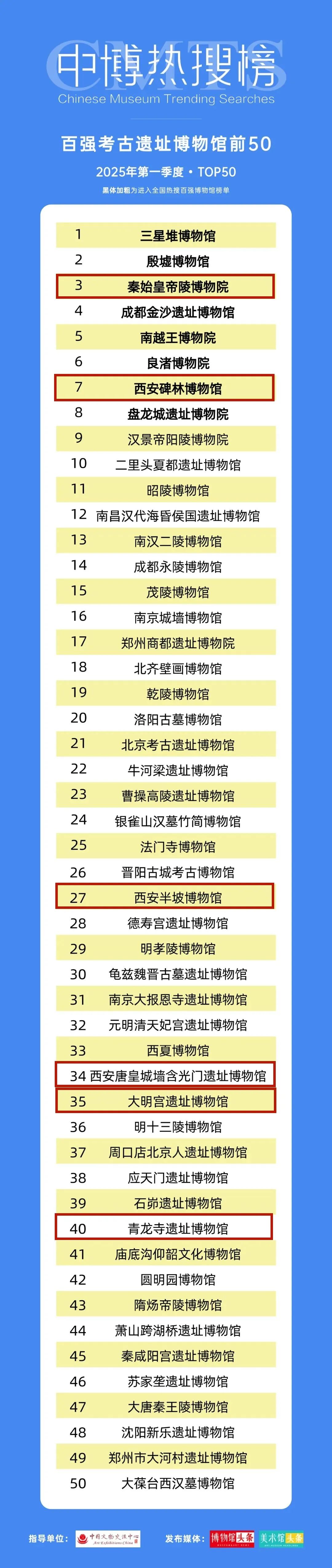 秦始皇帝陵博物院、西安碑林博物馆、西安半坡博物馆、西安唐皇城墙含光门遗址博物馆、大明宫遗址博物馆、青龙寺遗址博物馆入选2025年第一季度“百强考古遗址博物馆前50”榜单。