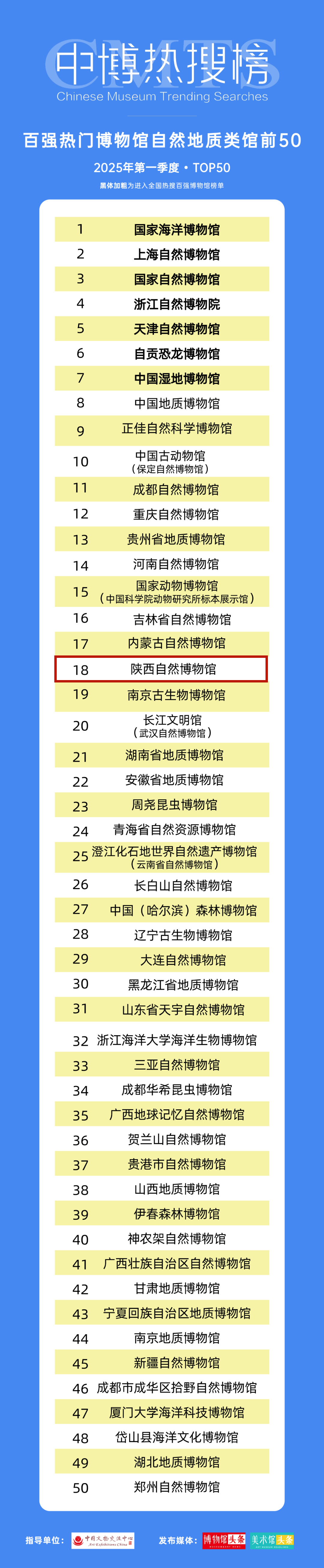陕西自然博物馆入选2025年第一季度“百强热门博物馆自然地质类馆前50”榜单。