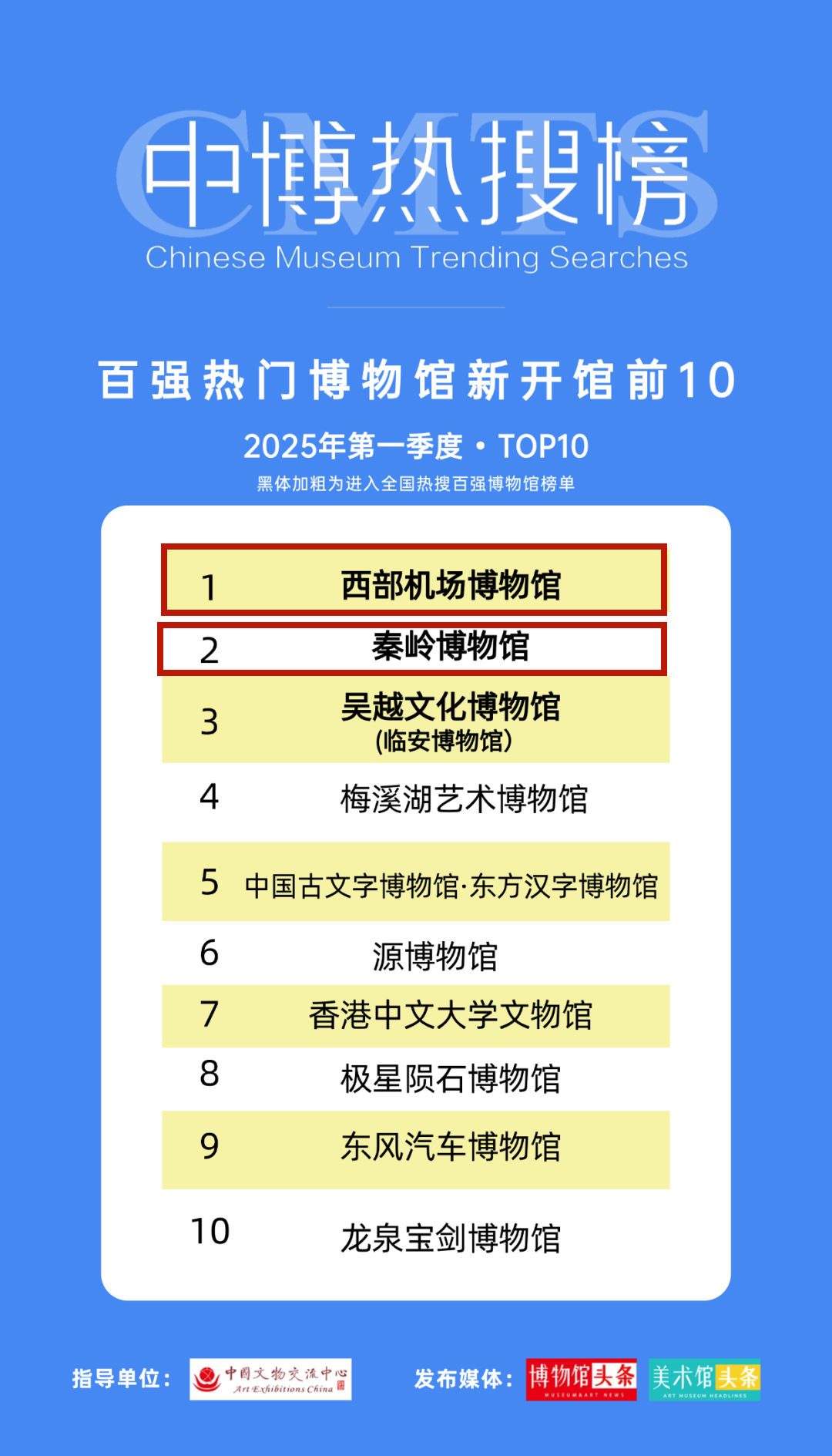 在2025年第一季度“全国十大热门新开或基本陈列改陈博物馆”中,西部机场博物馆、秦岭博物馆分别位列第一和第二。