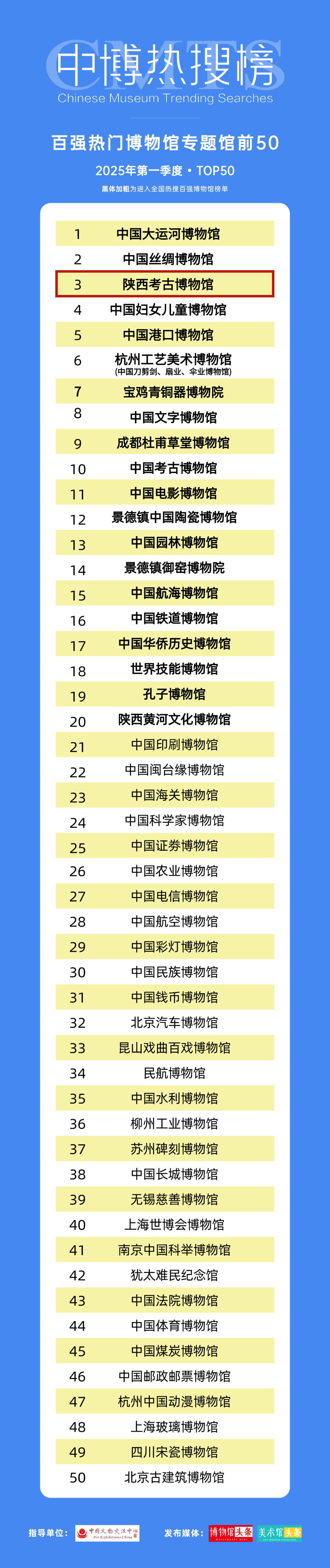 陕西考古博物馆入选2025年第一季度“百强热门博物馆专题馆前50”榜单。