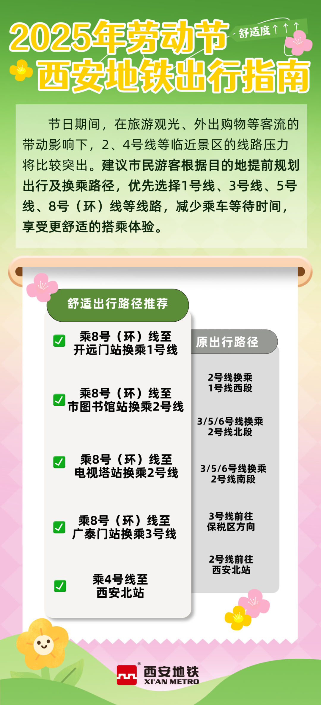 节日期间,在旅游观光、外出购物等客流的带动影响下,2号线、4号线等临近景区的线路压力将比较突出。预计从假期每天14:00起,西安站、永宁门、大唐芙蓉园、洒金桥、广济街、香湖湾等接驳交通枢纽及景区的地铁车站,进出客流将增长30%以上。