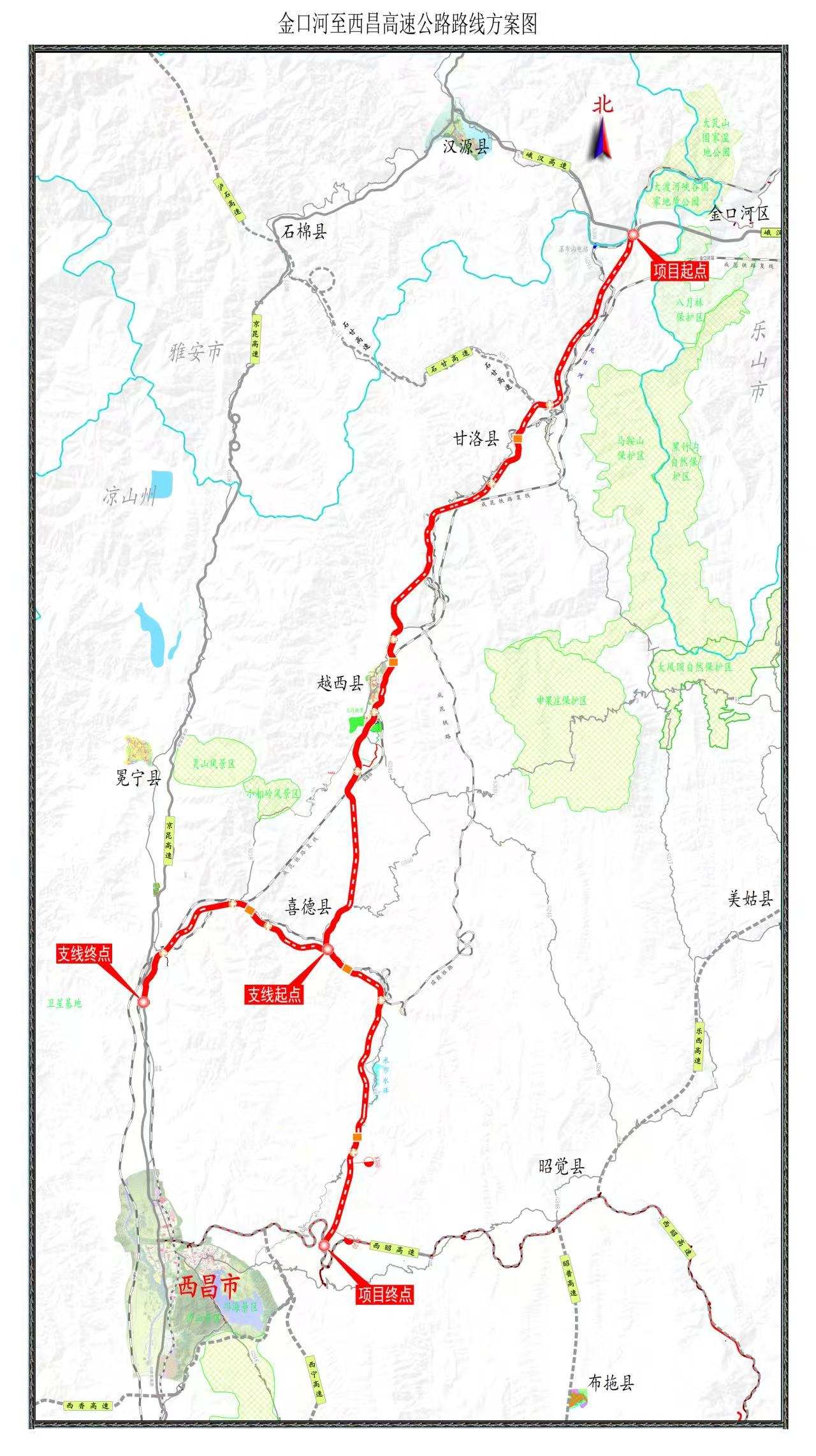 该项目主线起于凉山州甘洛县乌史大桥镇,设枢纽互通接峨眉至汉源高速公路金口河段,经越西县、喜德县,止于西昌市川兴镇,接在建的西昌至昭通高速公路;泸沽支线在凉山州喜德县城东侧设枢纽互通与主线衔接,止于凉山州冕宁县漫水湾镇接雅西高速。