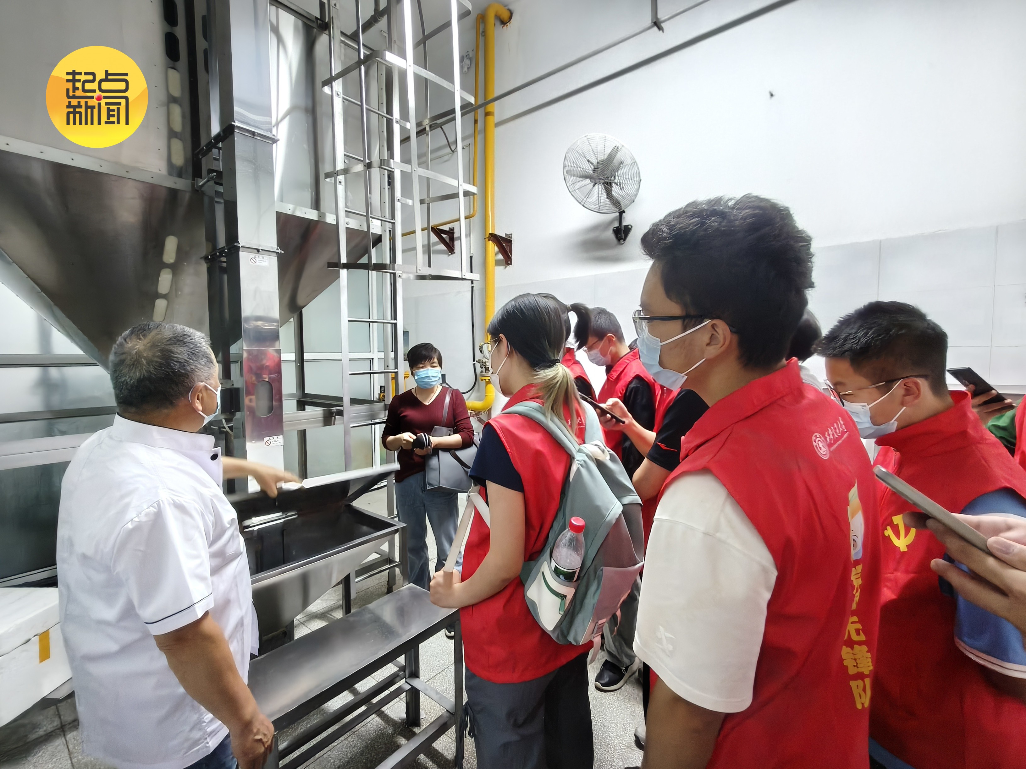 下午,在西安交通大学梧桐苑食堂米饭加工间,做饭师傅给前来参观的师生们讲解每天大量供应的米饭是如何新鲜出炉的。