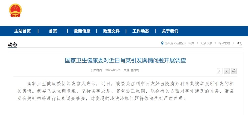 国家卫生健康委新闻发言人表示,近日,我委关注到中日友好医院胸外科肖某被举报所引发的相关舆情。我委已成立调查组,坚持实事求是、客观公正原则,联合有关方面对事件涉及的肖某、董某及有关机构等进行认真调查核查,对发现的违法违规问题将依法依纪严肃处理。