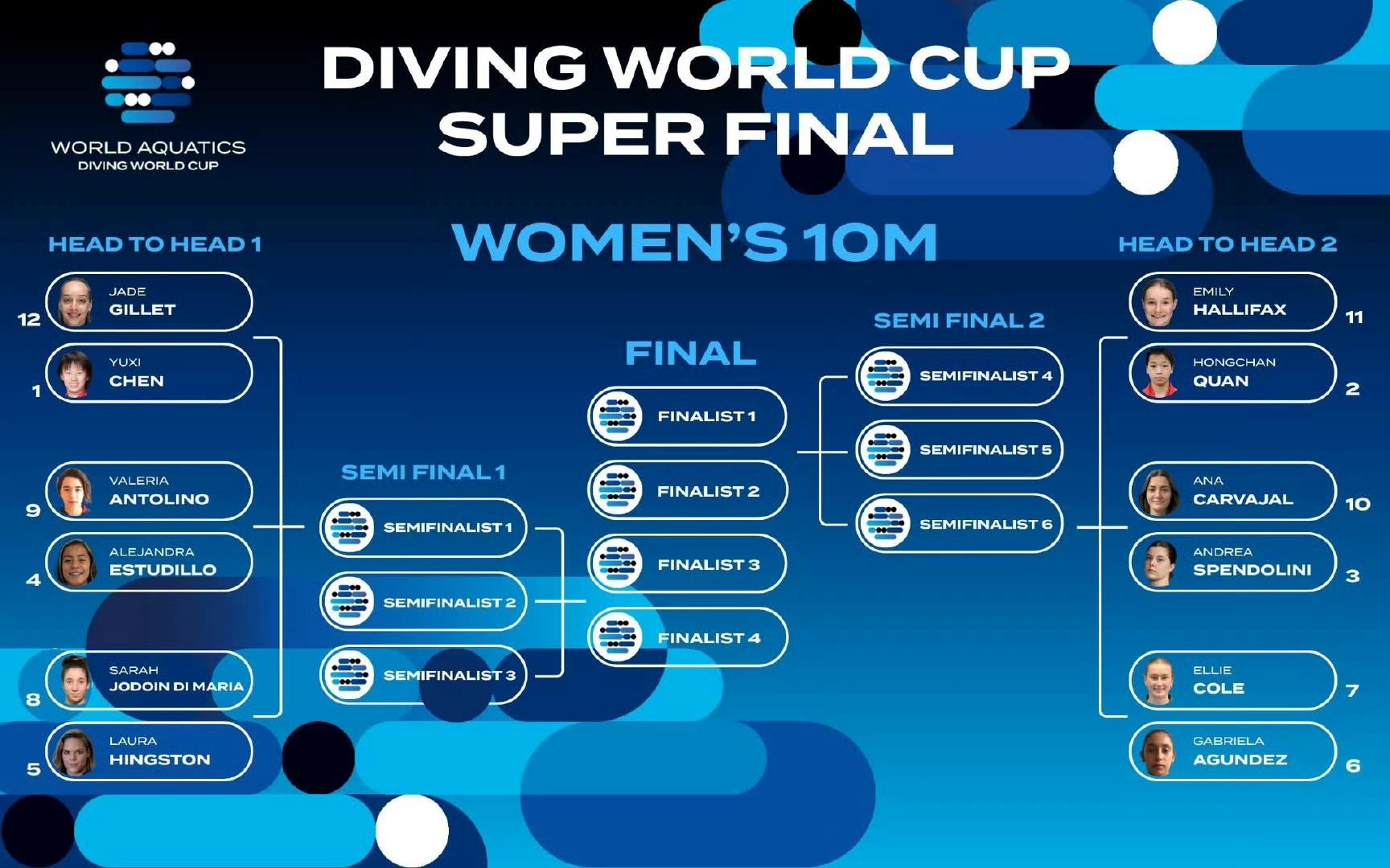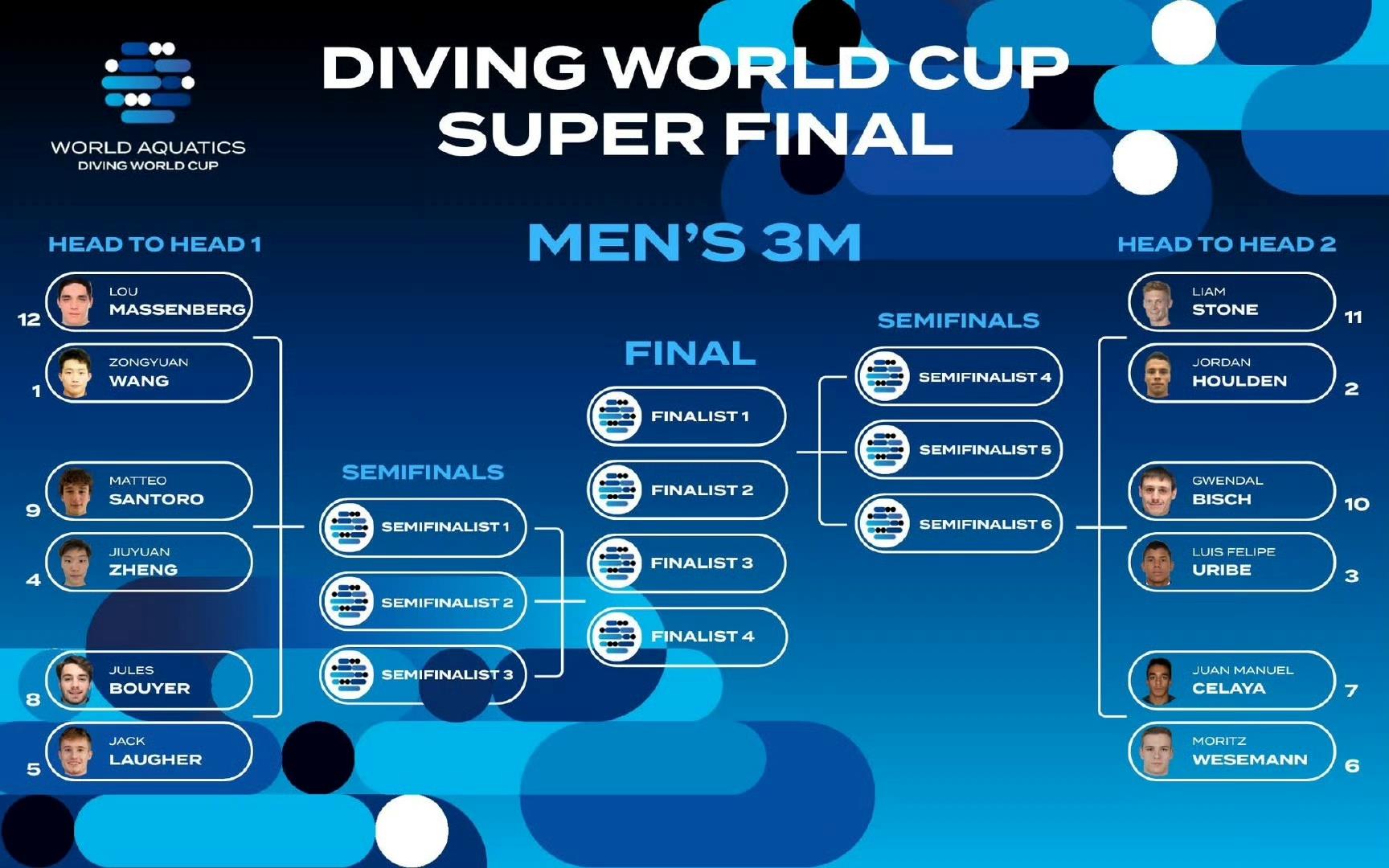 决赛阶段,4名选手必须完成完整的跳水清单(男子6个动作),从零开始计算成绩。