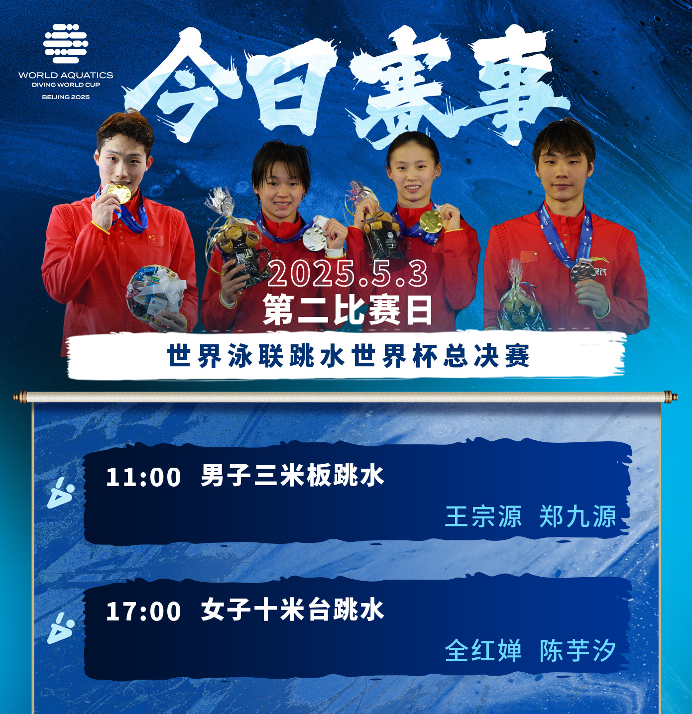北京时间5月3日,2025世界泳联跳水世界杯总决赛将在国家游泳中心(水立方)进入第二个比赛日,并将诞生2枚单人项目的金牌。男子3米板的王宗源和郑九源将迎接世界名将的挑战;全红婵和陈芋汐则将在女子10米台上演巅峰对决。