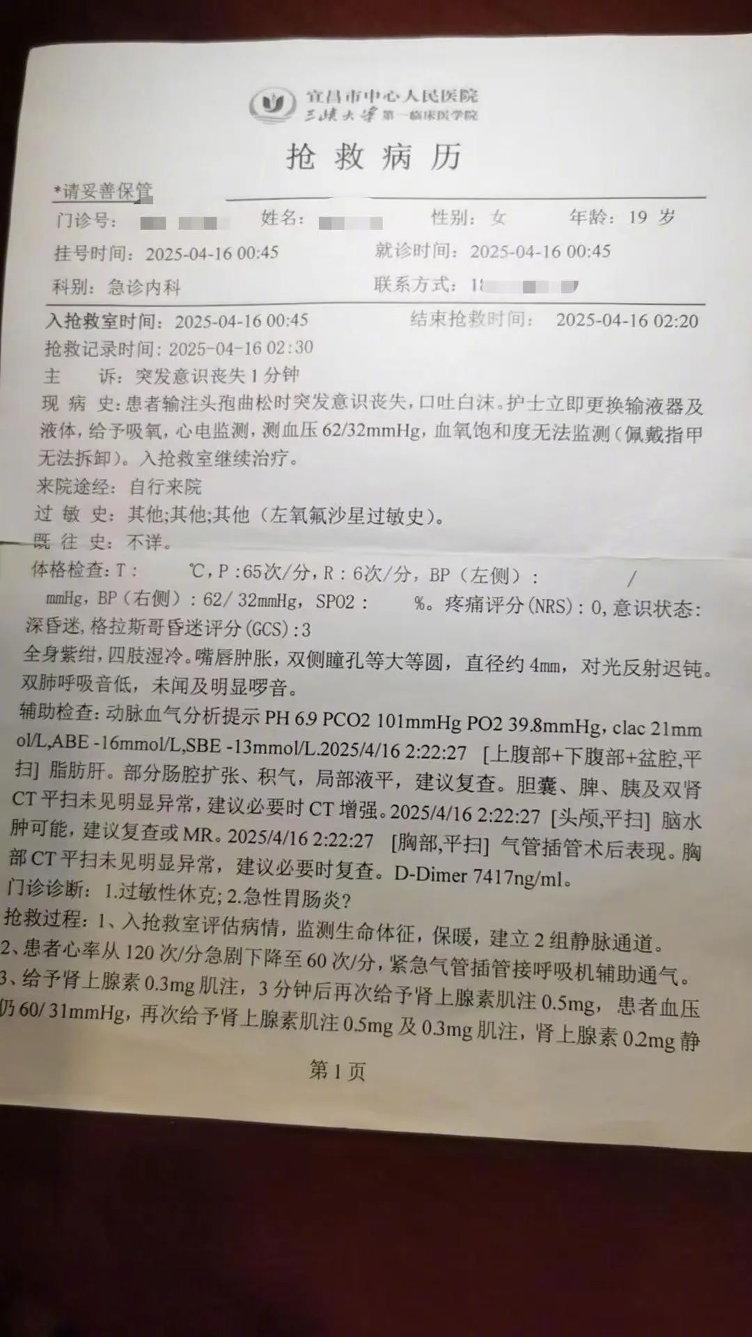 5月6日,小雯的家属向记者讲述了事发过程。4月15日22时57分左右,小雯因腹痛呕吐前往宜昌市中心人民医院西陵院区急诊内科就诊,三位同学陪伴同行。家属称,小雯正在读大一,平时身体很好,事发当天还曾跟奶奶聊天,“说找奶奶报销200元买鞋子的钱”。家属表示,入院后,医生曾询问其是否药物过敏,“小雯称不清楚”。此后,医生向其开具注射用头孢曲松钠、盐酸曲马多注射液等其他药物的处方。家属还说,据其同学透露,“小雯曾询问医生,注射头孢是否需要皮试,医生回复不需要”。