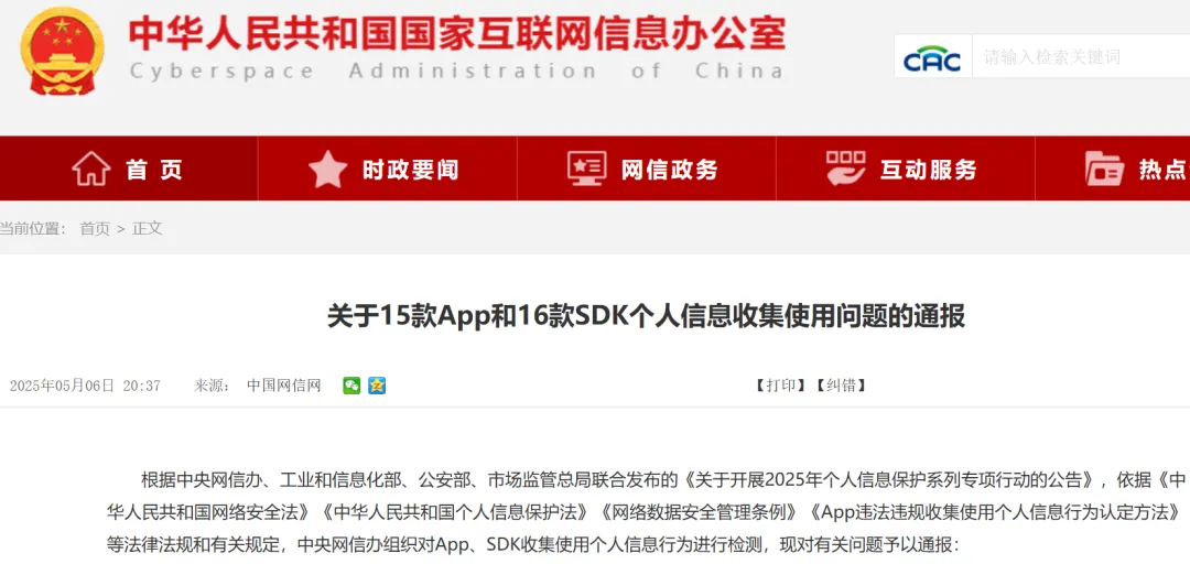 根据中央网信办、工业和信息化部、公安部、市场监管总局联合发布的《关于开展2025年个人信息保护系列专项行动的公告》,依据《中华人民共和国网络安全法》《中华人民共和国个人信息保护法》《网络数据安全管理条例》《App违法违规收集使用个人信息行为认定方法》等法律法规和有关规定,中央网信办组织对App、SDK收集使用个人信息行为进行检测,现对有关问题予以通报: