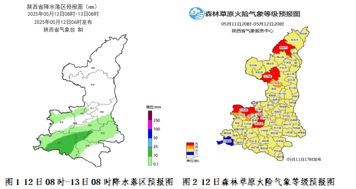 预计今天白天:全省多云,陕北北部部分有3~4级偏北风(3.4~7.9米/秒),阵风可达6级(10.8米/秒)以上。今天晚上:陕北多云间晴天,关中、陕南阴天。关中西部局地、秦岭山区有分散性阵雨(0.1~2毫米),陕南北部有小雨或阵雨(0.1~10毫米),陕南南部有小到中雨(5~15毫米)、局地大雨(15~20毫米)(图1)。陕北部分、关中北部有3~4级偏北风(3.4~7.9米/秒),阵风可达6~7级(10.8~17.1米/秒)。今日陕北北部部分和西部部分、关中西部森林草原火险气象等级为4~5级(高度~极高危险),需加强防范(图2)。