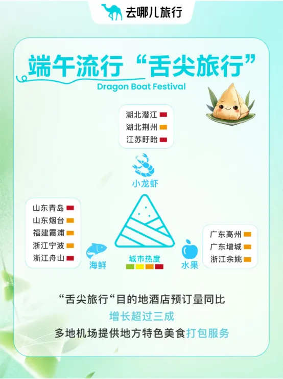 “去哪儿”报告还提到,“追逐时令美食”成为出行新动力。数据显示,前往潜江、荆州、青岛、宁波、舟山等城市的火车票预约量同比增长明显,酒店预订量同比增长超过三成,且仍在持续增长。