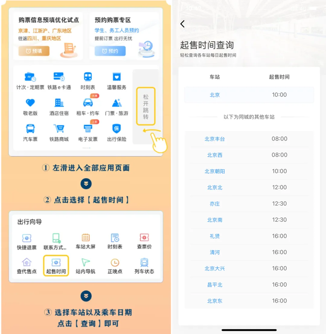 需要注意的是,不同火车站车票起售时间不同。以北京为例,北京西站、北京丰台站8点起售;北京站、北京朝阳站10点起售;北京北站中午12点起售;北京南站、亦庄站中午12点30分起售;北京东站、昌平北站、清河站、北京大兴站、礼贤站均16点起售。