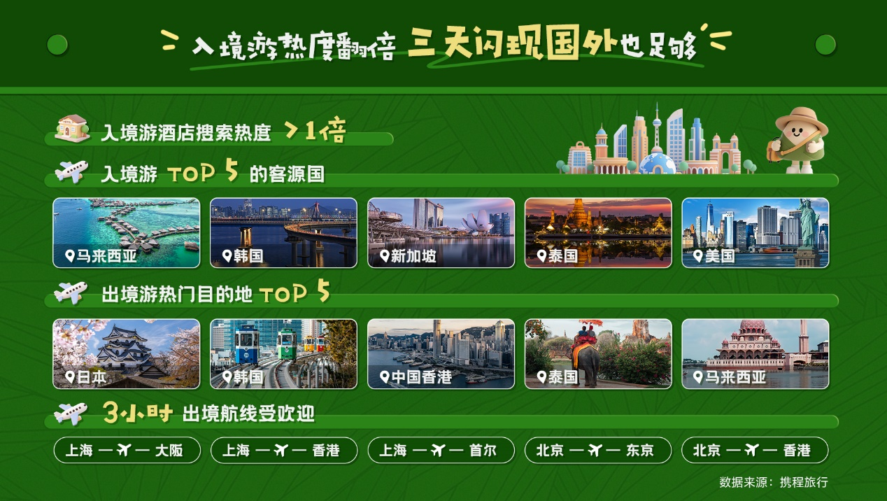 经过去年一年我国各项免签政策的逐步落地,老外们逐渐尝到了来华旅游的“甜头”。携程平台上,今年端午假期入境游酒店搜索热度超1倍,再次凸显China Travel对海外游客的吸引力。入境游前十目的地为上海、北京、广州、成都、重庆、深圳、杭州、昆明、青岛、西安。入境游前十的客源国为马来西亚、韩国、新加坡、泰国、美国、俄罗斯、日本、英国、澳大利亚、法国。