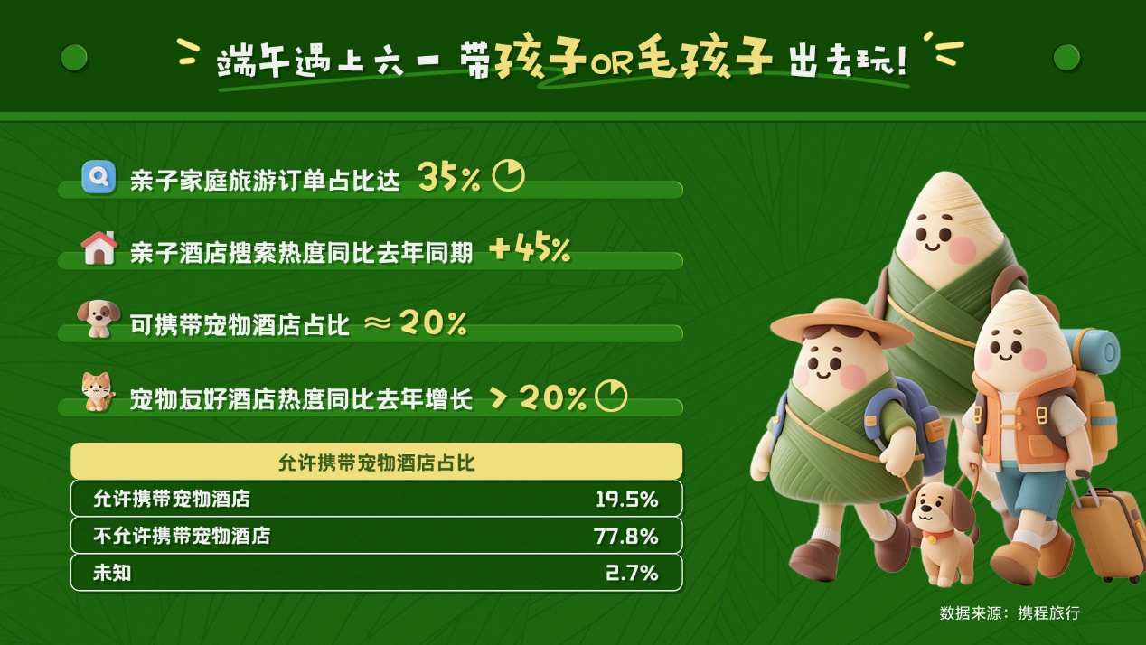 除带娃过六一,“毛孩子”家长们选择在端午带萌宠出游,它经济在端午出行市场再次展现了出巨大的潜力,携程酒店数据显示,端午期间宠物友好酒店热度同比去年增长超过20%,可携带宠物酒店占比近20%,且相较普通酒店,宠物友好酒店平均房价溢价近30%,折射情感附加值对旅游消费的撬动效应。