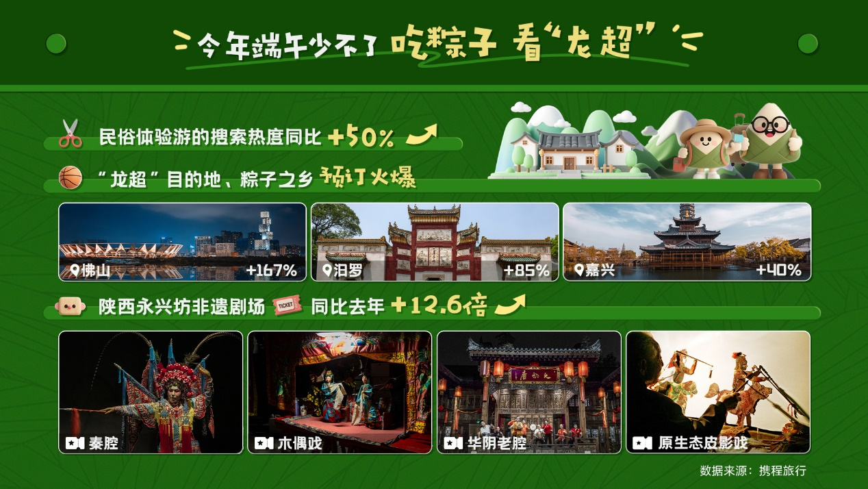 位于陕西的永兴坊非遗剧场则凭借秦腔+木偶戏+华阴老腔+原生态皮影戏的“非遗组合拳”在端午档一骑绝尘,园内四种非遗演出通场票售卖异常火爆,同比去年端午增长了12.6倍。自从2023年南海“龙超”的概念首次出现,既蕴含传统文化又凸显竞技魅力的龙船赛,吸引了全国各地游客的目光。携程数据显示端午假期期间,佛山整体旅游预订订单量同比去年增长167%,酒店订单量同比去年增长145%,机票订单量同比去年增长110%。屈原故里湖南汨罗和粽子之乡浙江嘉兴也在端午迎来一波游客热潮,截至5月13日,端午期间汨罗旅游预订订单量同比去年增长85%,酒店预订订单量同比去年增长88%;嘉兴旅游预订订单量同比增长40%,酒店预订订单同比增长63%。