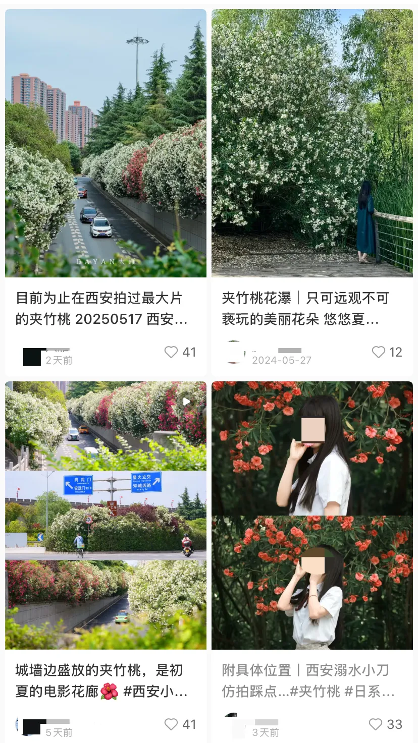 近日,市民在西安各处拍摄到夹竹桃。记者发现夹竹桃在尚武门、文昌门、朱雀门、浐灞国家湿地公园等地均有出现。