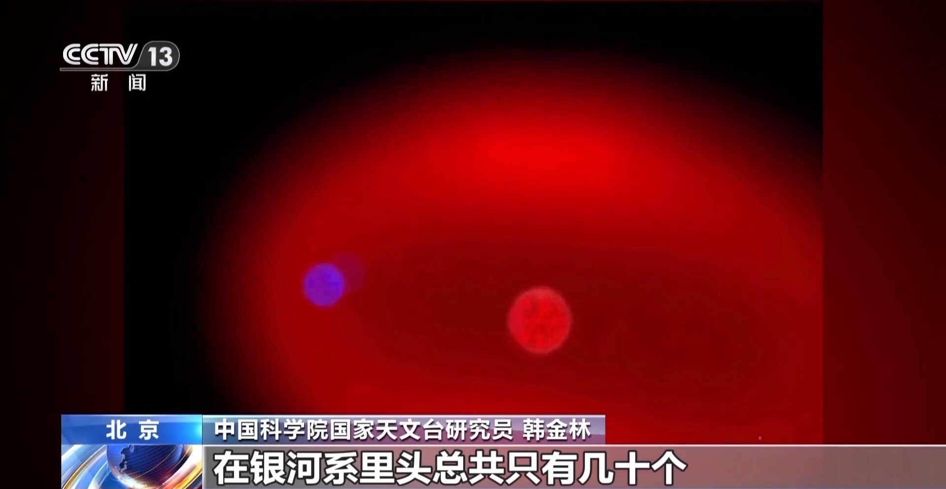 中国科学院国家天文台研究员 韩金林:一个脉冲星跟一个氦星互相绕转的这样的系统,在银河系里头总共只有几十个,银河系里有上千亿个恒星,这样的系统极其罕见。这种双星系统生存的时间特别短,所以特别不容易看见。
