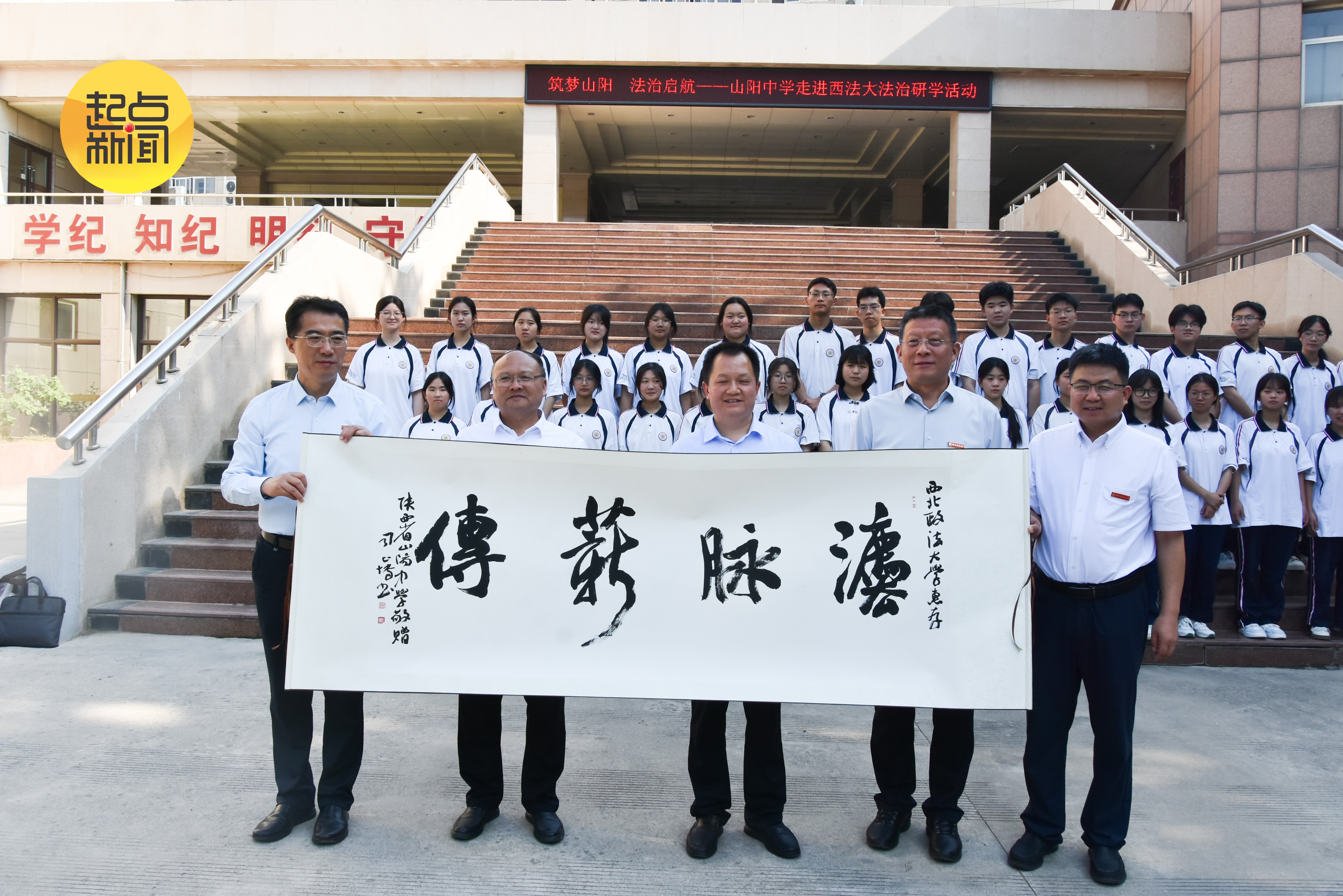 图书馆前,学校党委书记赵万东、副书记张军政热情接待来自山阳中学的师生代表,并向他们赠送了学校资深教授、陕西省前社科联主席赵馥洁先生的著作,同时为“小客人”准备了学习用品和精美礼物。山阳中学副校长虞华林向学校回赠了一幅由该校教师精心书写的“法脉薪传”墨宝以示敬意,孩子们也向赵万东老师赠送了精心制作的手工艺品以示感激。