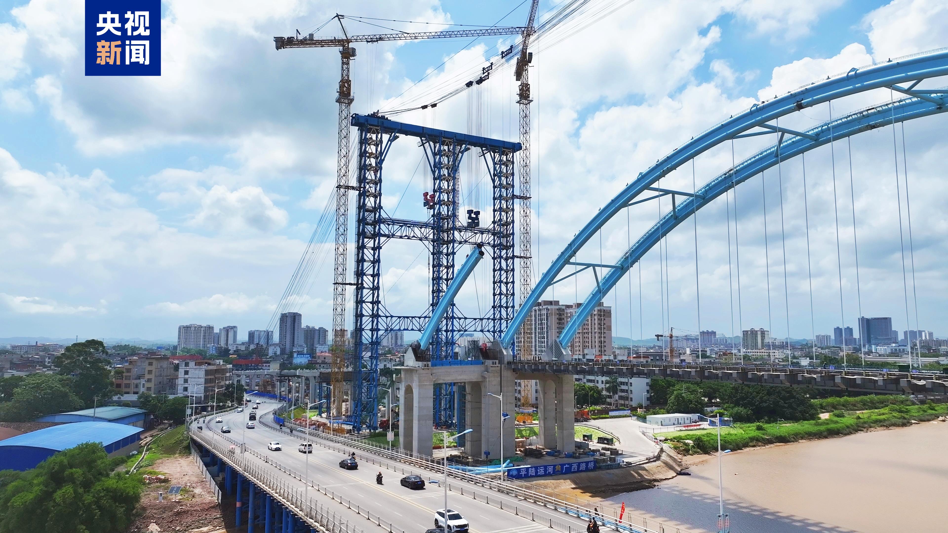 5月31日,平陆运河金海湾大桥右幅首节段拱肋顺利吊装完成,桥梁右幅进入主桥拱肋吊装施工阶段。