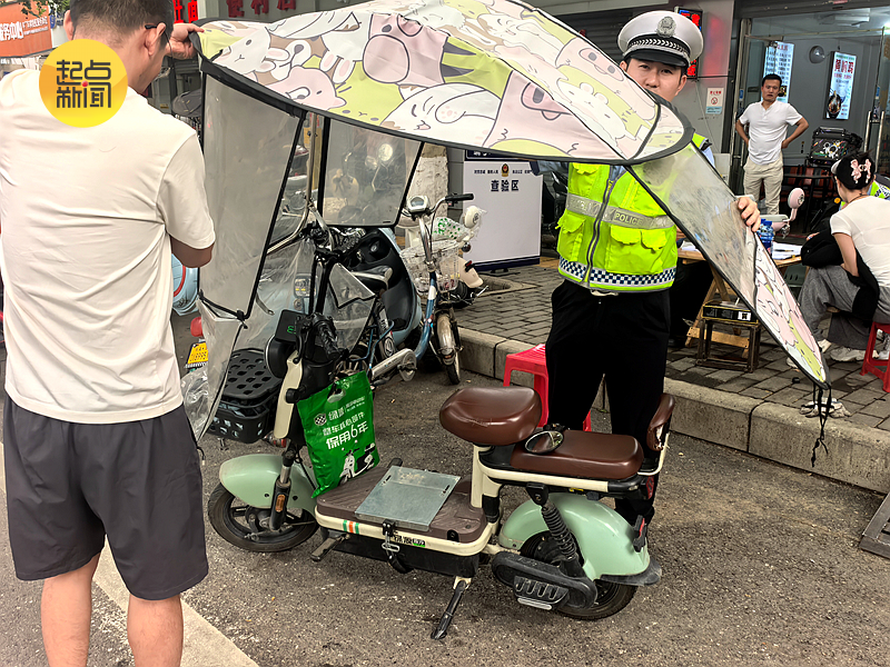 西安公安交管新城大队民警在纠正电动自行车违规加装遮雨棚