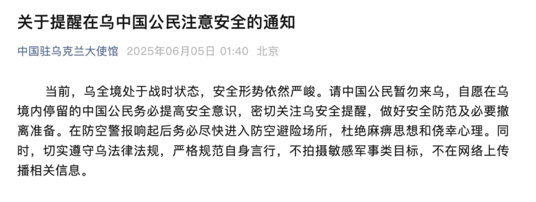 6月5日,中国驻乌克兰大使馆发布通知: