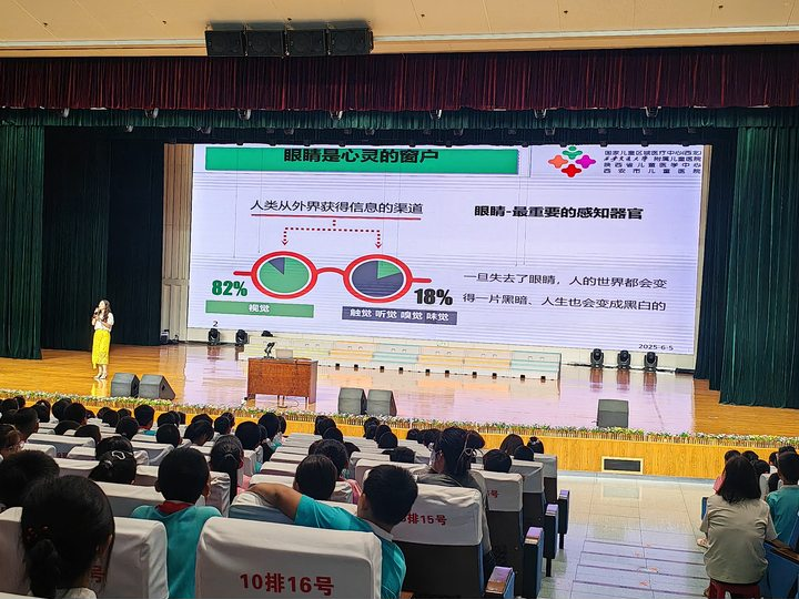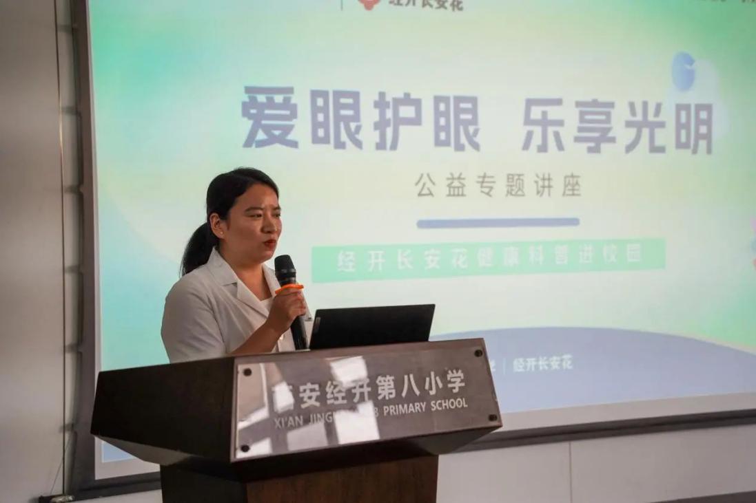 在西安经开第八小学,经验丰富的眼科医生以风趣幽默的方式引入主题,为学生开展“爱眼护眼,乐享光明”公益讲座,运用大量直观的数据,使学生深刻理解到保护视力的重要性。