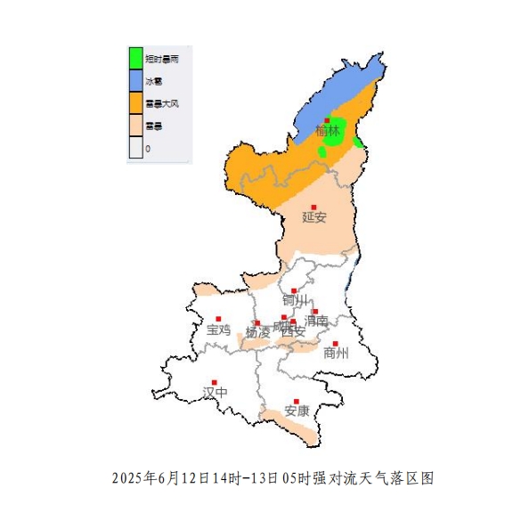 陕西省气象台 2025年06月12日发布强对流天气蓝色预警: 受高空槽和低层切变共同影响,预计6月12日14时至13日05时, 陕北大部、关中北部局地、秦巴山区局地有雷暴天气,其中榆林大部、 延安北部有雷暴大风,阵风可达8级(17.2m/s)以上,榆林北部局地 有冰雹,榆林中部及东部有短时强降水(小时雨强10-20mm/h,个别点 可达30mm/h以上)。