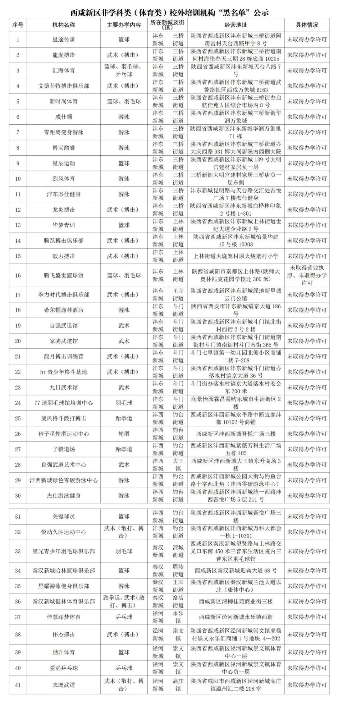 为进一步规范非学科类(体育类)校外培训市场秩序,切实保障学生和家长的合法权益,让家长能够直观了解培训机构的合规情况,近日,西咸新区向社会公布非学科类(体育类)校外培训机构“黑名单(第一批)”。