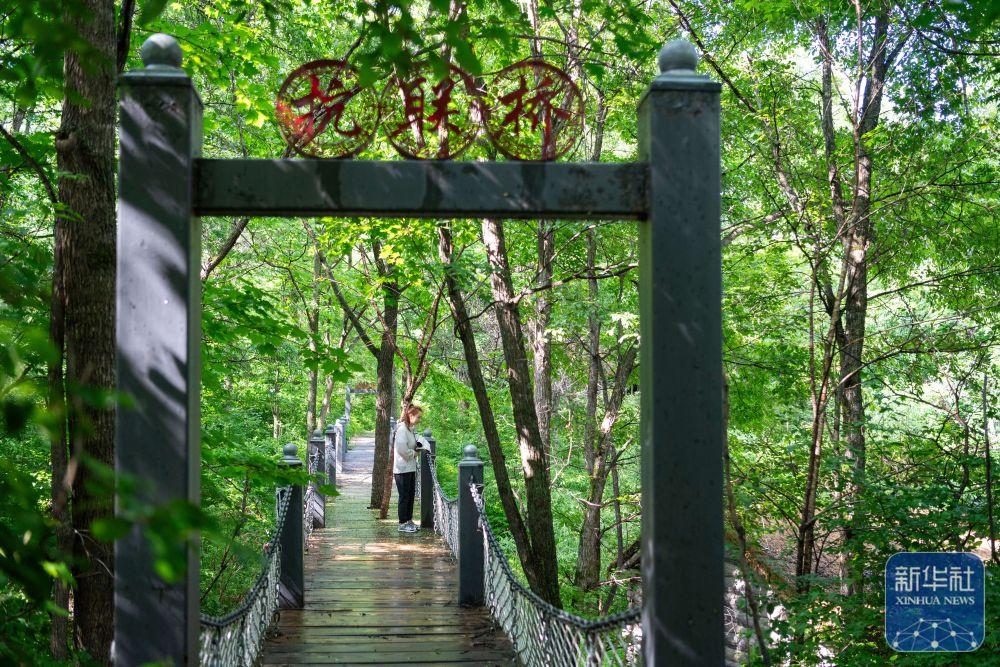 ↑ 6月17日,在七星山国家森林公园,游客走过抗联影视基地中的抗联桥。