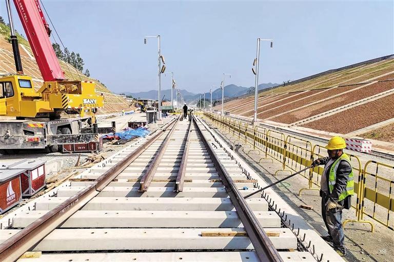 图为施工人员在山阳站进行道岔铺设作业。