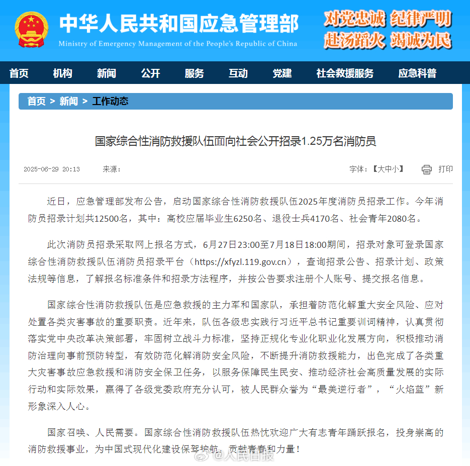 近日,应急管理部发布公告,启动国家综合性消防救援队伍2025年度消防员招录工作。今年消防员招录计划共12500名,其中:高校应届毕业生6250名、退役士兵4170名、社会青年2080名。