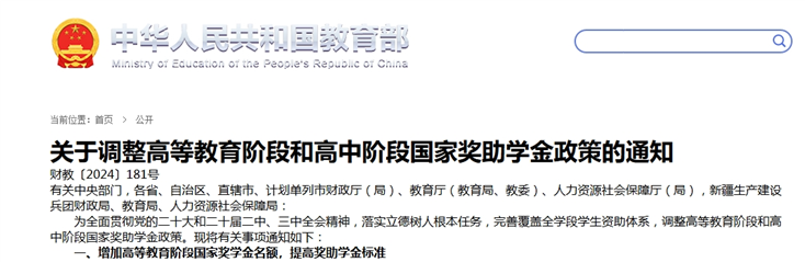 去年起,我国调整了高等教育阶段和高中阶段国家奖助学金政策,名额增加、奖励标准提高。