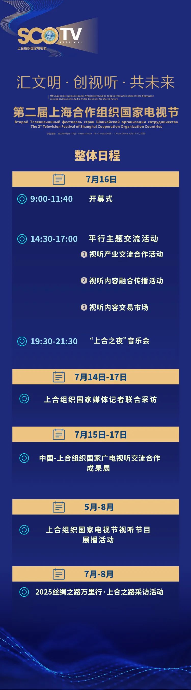 由国家广播电视总局、陕西省人民政府、上合组织秘书处联合主办的第二届上海合作组织国家电视节将于2025年7月15日至17日在西安举行。