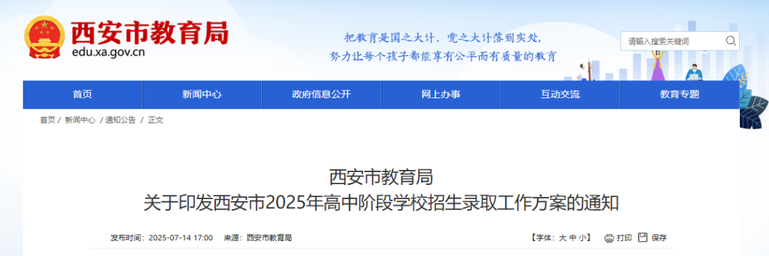 今天(7月14日)下午,西安市教育局发布《关于印发西安市2025年高中阶段学校招生录取工作方案的通知》。