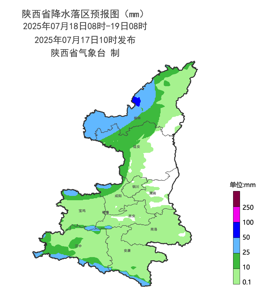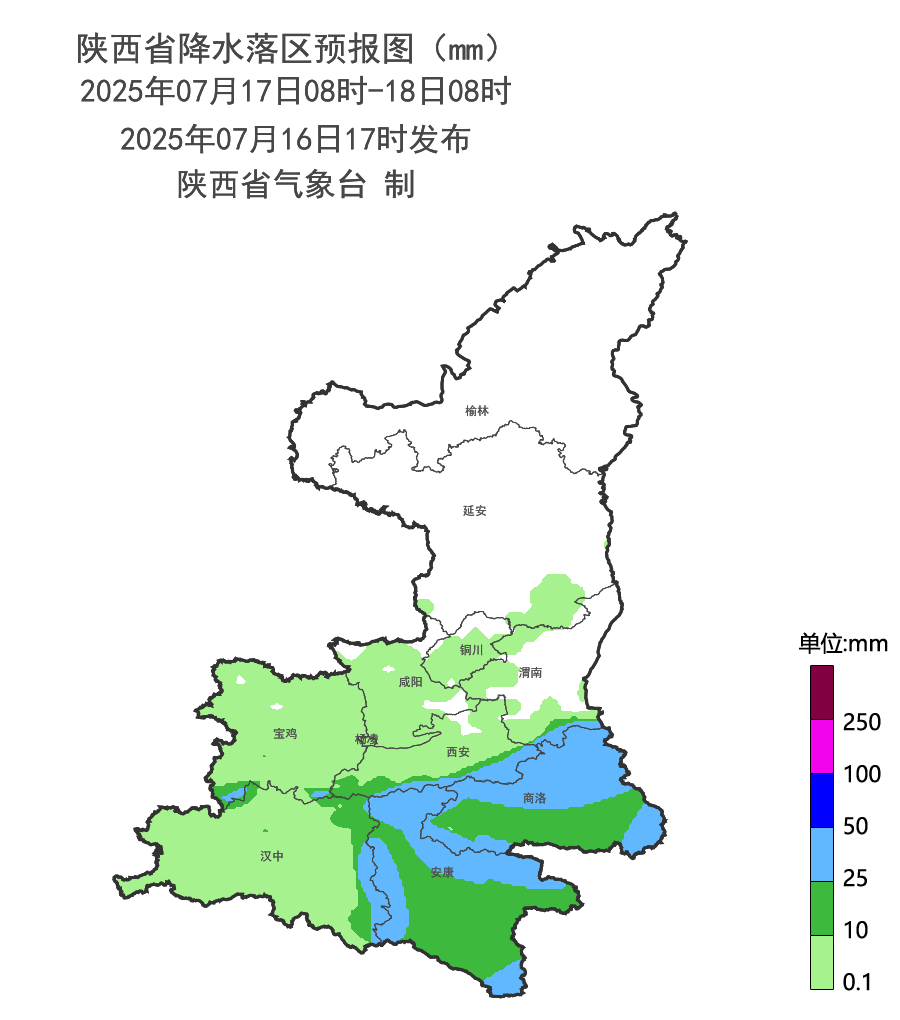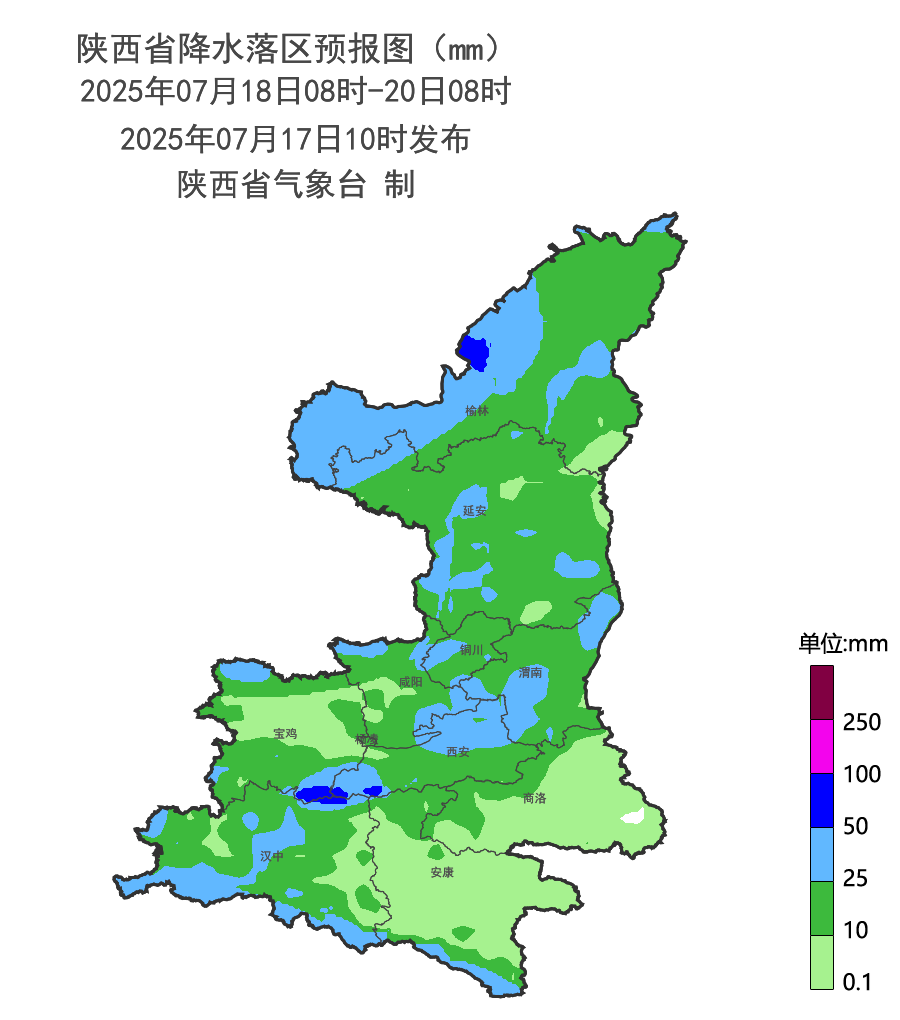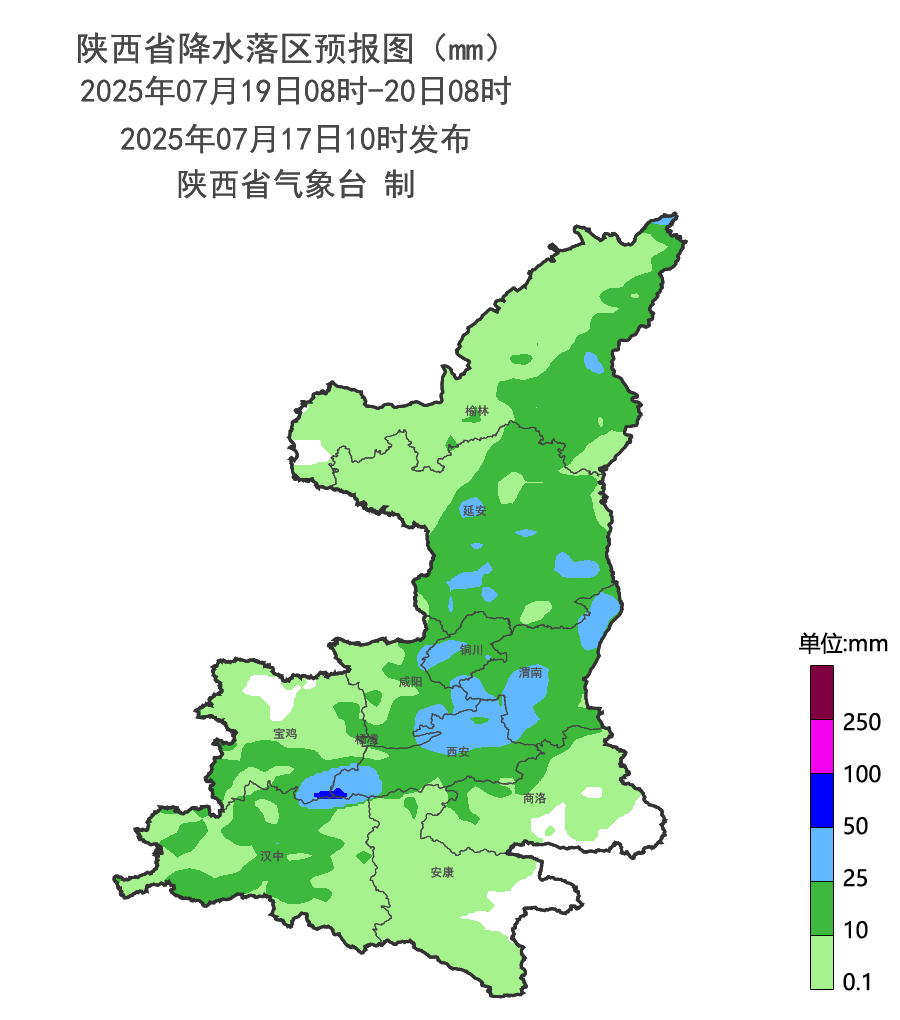 7月20日:陕北东部、关中部分、陕南西部有分散性小雨或阵雨(0.1~5毫米),陕南东部有小到中雨(0.1~25毫米)。