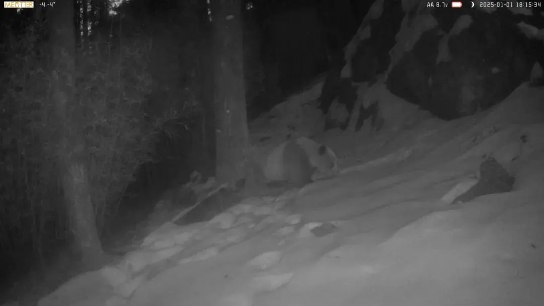 该段影像拍摄于2025年1月1日18点15分,地点位于保护区老县城保护站辖区、靠近秦岭主脊的正南沟。红外相机画面显示,这只棕色大熊猫体型健硕,在夜间雪地中行走,并表现出典型的领地标记行为——用臀部蹭擦树干,留下自身气味以宣示领地。